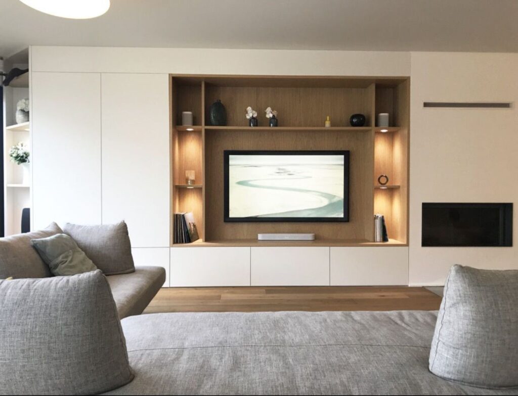 - L’intégration architecturale : niche dans le mur, panneau bois ou marbre, la TV disparaît dans le décor.