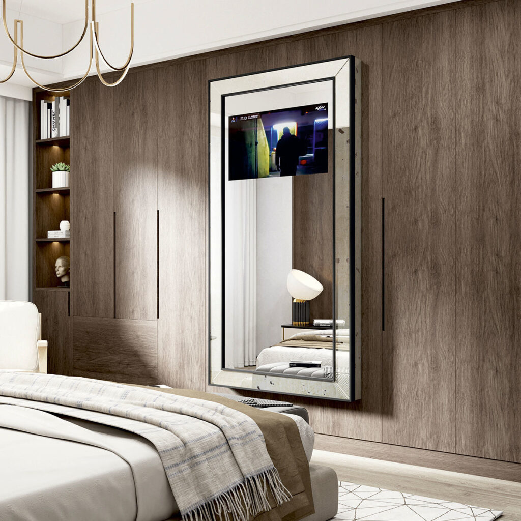 - Le miroir TV : l’écran se transforme en miroir lorsque la télévision est éteinte, une solution haut de gamme prisée dans les intérieurs luxueux.