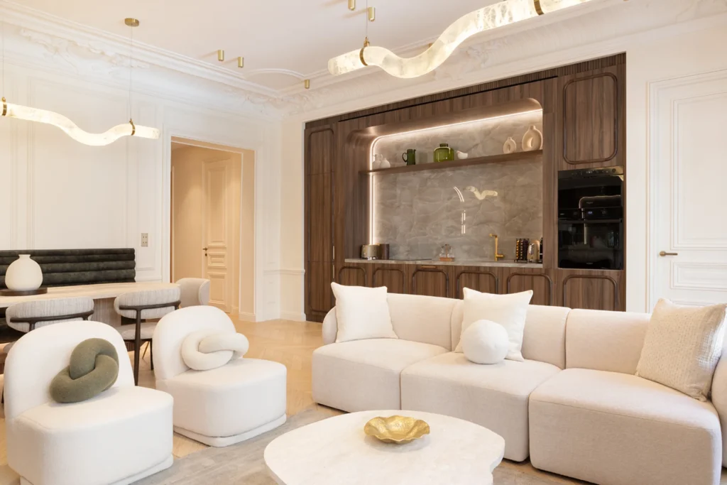 Dans le salon : optez pour un canapé arrondi, complété par une table basse ovale ou un fauteuil sculptural.