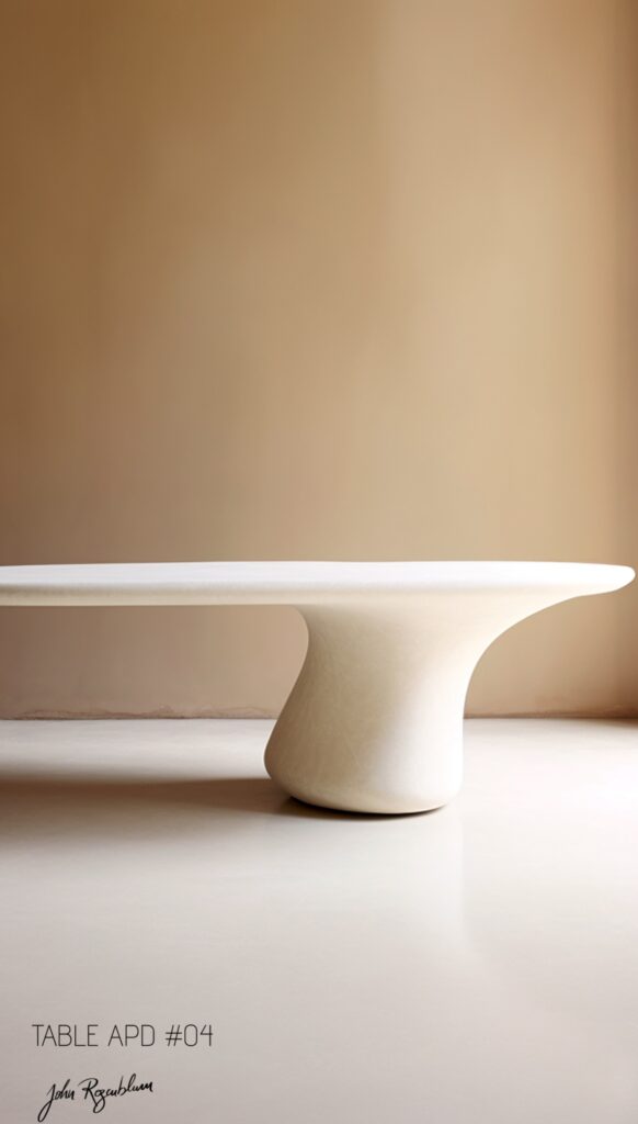 Les formes organiques rappellent les chefs-d’œuvre du design des années 60-70 (Eero Saarinen, Pierre Paulin) revisités aujourd’hui avec des matériaux contemporains.